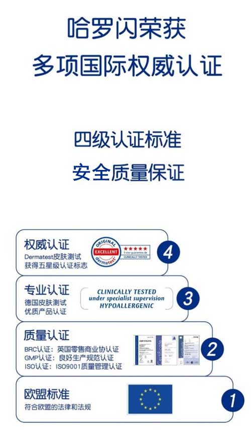 獲得Dermatest認(rèn)證,意味著哈羅閃產(chǎn)品從源頭把控,研發(fā)生產(chǎn)出對(duì)寶寶皮膚溫和無刺激,給予寶寶皮膚更為嚴(yán)謹(jǐn)、安全的呵護(hù)。