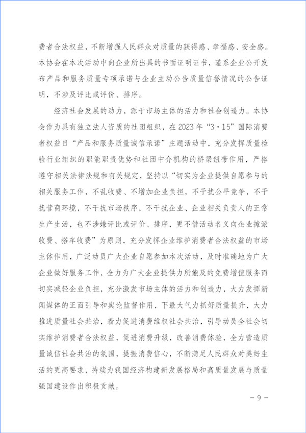 經(jīng)濟社會發(fā)展的動力,源于市場主體的活力和社會創(chuàng)造力。本協(xié)會作為具有獨立法人資質(zhì)的社團組織,在2023年“3·15”國際消費者權(quán)益日“產(chǎn)品和服務(wù)質(zhì)量誠信承諾”主題活動中,充分發(fā)揮質(zhì)量檢驗行業(yè)組織的職能職責(zé)優(yōu)勢和社團中介機構(gòu)的橋梁紐帶作用,嚴(yán)格遵守相關(guān)法律法規(guī)和有關(guān)規(guī)定,堅持以“切實為企業(yè)提供自愿參與的相關(guān)服務(wù)工作,不亂收費、不增加企業(yè)負擔(dān),不干擾公平競爭,不干擾營商環(huán)境,不干擾市場秩序,不干擾企業(yè)、企業(yè)相關(guān)負責(zé)人的正常生產(chǎn)生活,也不涉嫌評比或評價、排序,更不借活動名義向企業(yè)攤派收費、搭車收費”為原則,充分發(fā)揮企業(yè)維護消費者合法權(quán)益的市場主體作用,廣泛動員廣大企業(yè)自愿參加本次活動,及時準(zhǔn)確地為廣大企業(yè)做好服務(wù)工作,全力為廣大企業(yè)提供力所能及的免費增值服務(wù)而切實減輕企業(yè)負擔(dān),充分激發(fā)市場主體的活力和創(chuàng)造力,大力發(fā)揮新聞媒體的正面引導(dǎo)和輿論監(jiān)督作用,下最大氣力抓好質(zhì)量提升,大力推進質(zhì)量社會共治,著力促進消費維權(quán)社會共治,引導(dǎo)動員全社會切實維護消費者合法權(quán)益,促進消費升級,改善消費體驗,全力營造質(zhì)量誠信社會共治的氛圍,提振消費信心,不斷滿足人民群眾對美好生活的更高要求,持續(xù)為我國經(jīng)濟構(gòu)建新發(fā)展格局和高質(zhì)量發(fā)展與質(zhì)量強國建設(shè)作出積極貢獻。