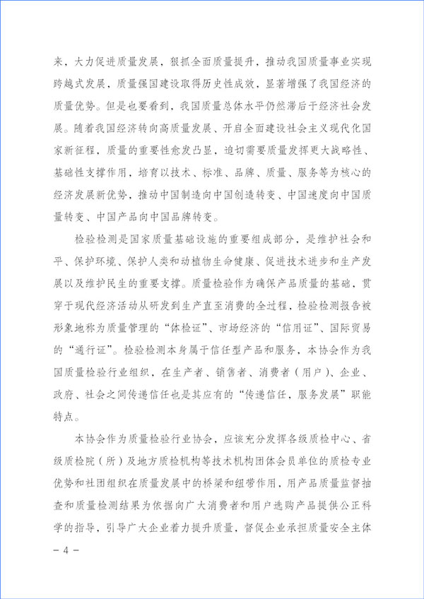 本協(xié)會作為質(zhì)量檢驗行業(yè)協(xié)會,應(yīng)該充分發(fā)揮各級質(zhì)檢中心、省級質(zhì)檢院(所)及地方質(zhì)檢機構(gòu)等技術(shù)機構(gòu)團體會員單位的質(zhì)檢專業(yè)優(yōu)勢和社團組織在質(zhì)量發(fā)展中的橋梁和紐帶作用,用產(chǎn)品質(zhì)量監(jiān)督抽查和質(zhì)量檢測結(jié)果為依據(jù)向廣大消費者和用戶選購產(chǎn)品提供公正科學(xué)的指導(dǎo),引導(dǎo)廣大企業(yè)著力提升質(zhì)量,督促企業(yè)承擔(dān)質(zhì)量安全主體作用,倡導(dǎo)企業(yè)自覺履行社會責(zé)任,并切實運用輿論宣傳作用,向全社會提供公正可靠的質(zhì)量信息和消費信息,傳遞質(zhì)量信任,引導(dǎo)質(zhì)量消費,有效幫助消費者選擇高標(biāo)準(zhǔn)高質(zhì)量產(chǎn)品,助力質(zhì)量供給側(cè)結(jié)構(gòu)性改革,抓好質(zhì)量提升,推進質(zhì)量強國建設(shè)。