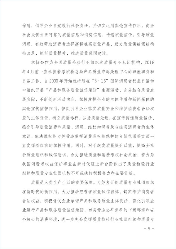 本協(xié)會作為全國質(zhì)量檢驗行業(yè)組織和質(zhì)量專業(yè)社團機構(gòu),2018年4月前一直承擔(dān)著原質(zhì)檢總局產(chǎn)品質(zhì)量申訴處理中心的職能職責(zé)和日常工作,自2000年開始就持續(xù)在“3·15”國際消費者權(quán)益日活動中組織開展“產(chǎn)品和服務(wù)質(zhì)量誠信承諾”主題活動,充分結(jié)合質(zhì)量發(fā)展實際,不斷創(chuàng)新活動內(nèi)容,積極發(fā)揮企業(yè)的主體作用和新聞媒體的輿論宣傳監(jiān)督作用,督促引導(dǎo)企業(yè)落實質(zhì)量安全和維護消費者合法權(quán)益的主體責(zé)任,樹立質(zhì)量標(biāo)桿,弘揚質(zhì)量先進,在宣傳傳遞質(zhì)量信任、推介引導(dǎo)質(zhì)量消費和質(zhì)量、消費、維權(quán)知識普及與提高消費者的主體意識、依法維權(quán)能力并營造重視消費者權(quán)益保護的良好氛圍等方面一直發(fā)揮著應(yīng)有的積極作用。同時,對于激發(fā)質(zhì)量提升動能,提高全社會質(zhì)量意識和誠信意識,合力推進質(zhì)量和消費維權(quán)社會共治,著力為我國消費者權(quán)益保護事業(yè)在新時代邁上新臺階作出了質(zhì)量檢驗行業(yè)組織和質(zhì)量專業(yè)社團機構(gòu)不可或缺的積極努力和必要貢獻。