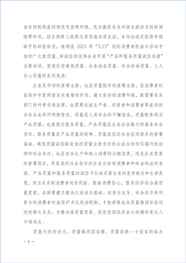 質(zhì)量是人類生產(chǎn)生活的重要保障。為努力開創(chuàng)質(zhì)量專業(yè)社團組織在新時代的新作用,大力推動經(jīng)營者質(zhì)量誠信自律,切實維護消費者合法權(quán)益,積極督促企業(yè)承諾產(chǎn)品和服務(wù)質(zhì)量主體責(zé)任,強化引領(lǐng)企業(yè)履行產(chǎn)品和服務(wù)質(zhì)量誠信承諾,切實營造公平競爭的市場環(huán)境和安全放心的消費環(huán)境,進一步充分發(fā)揮質(zhì)量檢驗行業(yè)社團組織和質(zhì)量專業(yè)社團機構(gòu)在持續(xù)優(yōu)化營商環(huán)境、充分激發(fā)各類市場主體活力的橋梁紐帶作用,助力保障人民群眾享有高品質(zhì)生活,本協(xié)會決定按照章程賦予的職能職責(zé),繼續(xù)在2023年“3·15”國際消費者權(quán)益日活動中組織廣大重質(zhì)量、講誠信的優(yōu)秀企業(yè)開展“產(chǎn)品和服務(wù)質(zhì)量誠信承諾”主題活動,營造政府重視質(zhì)量、企業(yè)追求質(zhì)量、社會崇尚質(zhì)量、人人關(guān)心質(zhì)量的良好氛圍。