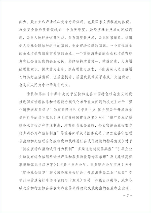 質(zhì)量興則經(jīng)濟興,質(zhì)量強則國家強。質(zhì)量反映一個國家的綜合實力,是企業(yè)和產(chǎn)業(yè)核心競爭力的體現(xiàn),也是國家文明程度的體現(xiàn)。質(zhì)量安全作為質(zhì)量領(lǐng)域的一個重要維度,是經(jīng)濟社會發(fā)展的戰(zhàn)略問題,關(guān)系人民群眾切身利益,關(guān)系高質(zhì)量發(fā)展,關(guān)系國家形象。信用是人類社會聯(lián)結(jié)和運行的基礎(chǔ),也是市場經(jīng)濟的基礎(chǔ)。一個重視質(zhì)量的企業(yè)才是有前途有希望的企業(yè),一個重視消費者的企業(yè)也才是有魅力有社會責(zé)任感的企業(yè)公民。始終堅持質(zhì)量第一、效益優(yōu)先,大力增強質(zhì)量意識,視質(zhì)量為生命,以高質(zhì)量為追求,不斷滿足人民日益增長的美好生活需要,讓質(zhì)量提升、質(zhì)量發(fā)展的成果惠及廣大消費者,也是以人民為中心的題中之義。