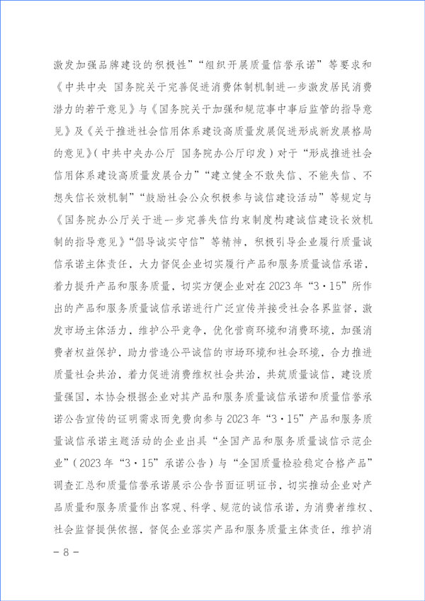 為貫徹落實《中共中央關(guān)于堅持和完善中國特色社會主義制度 推進國家治理體系和治理能力現(xiàn)代化若干重大問題的決定》對于“強化消費者權(quán)益保護”的重要精神和《中共中央 國務(wù)院關(guān)于開展質(zhì)量提升行動的指導(dǎo)意見》與《質(zhì)量強國建設(shè)綱要》對于“推廣實施優(yōu)質(zhì)服務(wù)承諾標(biāo)識和管理制度,培育知名服務(wù)品牌,全面實施企業(yè)標(biāo)準(zhǔn)自我聲明公開和監(jiān)督制度”等重要部署及《國務(wù)院關(guān)于建立完善守信聯(lián)合激勵和失信聯(lián)合懲戒制度加快推進社會誠信建設(shè)的指導(dǎo)意見》對于“健全褒揚和激勵誠信行為機制”“多渠道選樹誠信典型”“引導(dǎo)企業(yè)主動發(fā)布綜合信用承諾或產(chǎn)品和服務(wù)質(zhì)量等專項承諾”及《建設(shè)高標(biāo)準(zhǔn)市場體系行動方案》(中共中央辦公廳、國務(wù)院辦公廳印發(fā))關(guān)于“健全社會監(jiān)督”和《國務(wù)院辦公廳關(guān)于開展消費品工業(yè)“三品”專項行動營造良好市場環(huán)境的若干意見》有關(guān)“加強輿論引導(dǎo),地方各級政府和行業(yè)協(xié)會要表彰和宣傳品牌建設(shè)成就突出的企業(yè)和企業(yè)家,激發(fā)加強品牌建設(shè)的積極性”“組織開展質(zhì)量信譽承諾”等要求和《中共中央 國務(wù)院關(guān)于完善促進消費體制機制進一步激發(fā)居民消費潛力的若干意見》與《國務(wù)院關(guān)于加強和規(guī)范事中事后監(jiān)管的指導(dǎo)意見》及《關(guān)于推進社會信用體系建設(shè)高質(zhì)量發(fā)展促進形成新發(fā)展格局的意見》(中共中央辦公廳 國務(wù)院辦公廳印發(fā))對于“形成推進社會信用體系建設(shè)高質(zhì)量發(fā)展合力”“建立健全不敢失信、不能失信、不想失信長效機制”“鼓勵社會公眾積極參與誠信建設(shè)活動”等規(guī)定與《國務(wù)院辦公廳關(guān)于進一步完善失信約束制度構(gòu)建誠信建設(shè)長效機制的指導(dǎo)意見》“倡導(dǎo)誠實守信”等精神,積極引導(dǎo)企業(yè)履行質(zhì)量誠信承諾主體責(zé)任,大力督促企業(yè)切實履行產(chǎn)品和服務(wù)質(zhì)量誠信承諾,著力提升產(chǎn)品和服務(wù)質(zhì)量,切實方便企業(yè)對在2023年“3·15”所作出的產(chǎn)品和服務(wù)質(zhì)量誠信承諾進行廣泛宣傳并接受社會各界監(jiān)督,激發(fā)市場主體活力,維護公平競爭,優(yōu)化營商環(huán)境和消費環(huán)境,加強消費者權(quán)益保護,助力營造公平誠信的市場環(huán)境和社會環(huán)境,合力推進質(zhì)量社會共治,著力促進消費維權(quán)社會共治,共筑質(zhì)量誠信,建設(shè)質(zhì)量強國,本協(xié)會根據(jù)企業(yè)對其產(chǎn)品和服務(wù)質(zhì)量誠信承諾和質(zhì)量信譽承諾公告宣傳的證明需求而免費向參與2023年“3·15”產(chǎn)品和服務(wù)質(zhì)量誠信承諾主題活動的企業(yè)出具“全國產(chǎn)品和服務(wù)質(zhì)量誠信示范企業(yè)”(2023年“3·15”承諾公告)與“全國質(zhì)量檢驗穩(wěn)定合格產(chǎn)品”調(diào)查匯總和質(zhì)量信譽承諾展示公告書面證明證書,切實推動企業(yè)對產(chǎn)品質(zhì)量和服務(wù)質(zhì)量作出客觀、科學(xué)、規(guī)范的誠信承諾,為消費者維權(quán)、社會監(jiān)督提供依據(jù),督促企業(yè)落實產(chǎn)品和服務(wù)質(zhì)量主體責(zé)任,維護消費者合法權(quán)益,不斷增強人民群眾對質(zhì)量的獲得感、幸福感、安全感。本協(xié)會在本次活動中向企業(yè)所出具的書面證明證書,謹(jǐn)系企業(yè)公開發(fā)布產(chǎn)品和服務(wù)質(zhì)量專項承諾與企業(yè)主動公告質(zhì)量信譽情況的公告證明,不涉及評比或評價、排序。