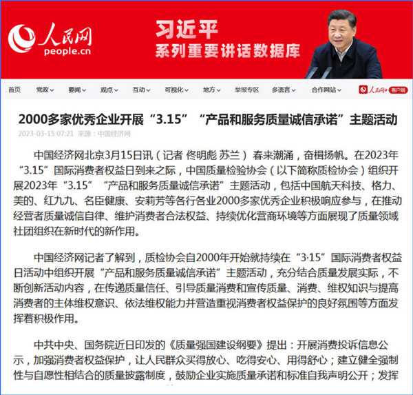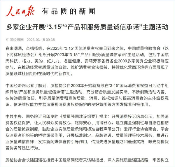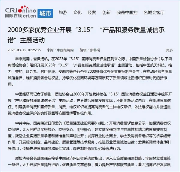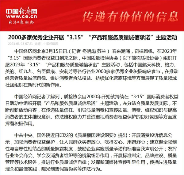 中國經(jīng)濟網(wǎng):2000多家優(yōu)秀企業(yè)開展“3·15”“產(chǎn)品和服務(wù)質(zhì)量誠信承諾”主題活動