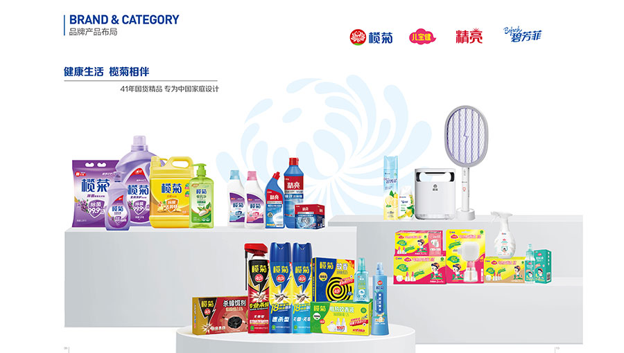 主要產(chǎn)品:欖菊盤式蚊香、電熱蚊香液、驅(qū)蚊液、電熱蚊香片、電蚊香加熱器、殺蟲氣霧劑、殺蟑餌劑、滅蚊燈、電蚊拍、洗衣液、洗潔精、洗衣粉、洗衣皂、洗手液、84消毒液、潔廁精(液)、花露水、空氣清新劑、清香凝膠、生活用紙等