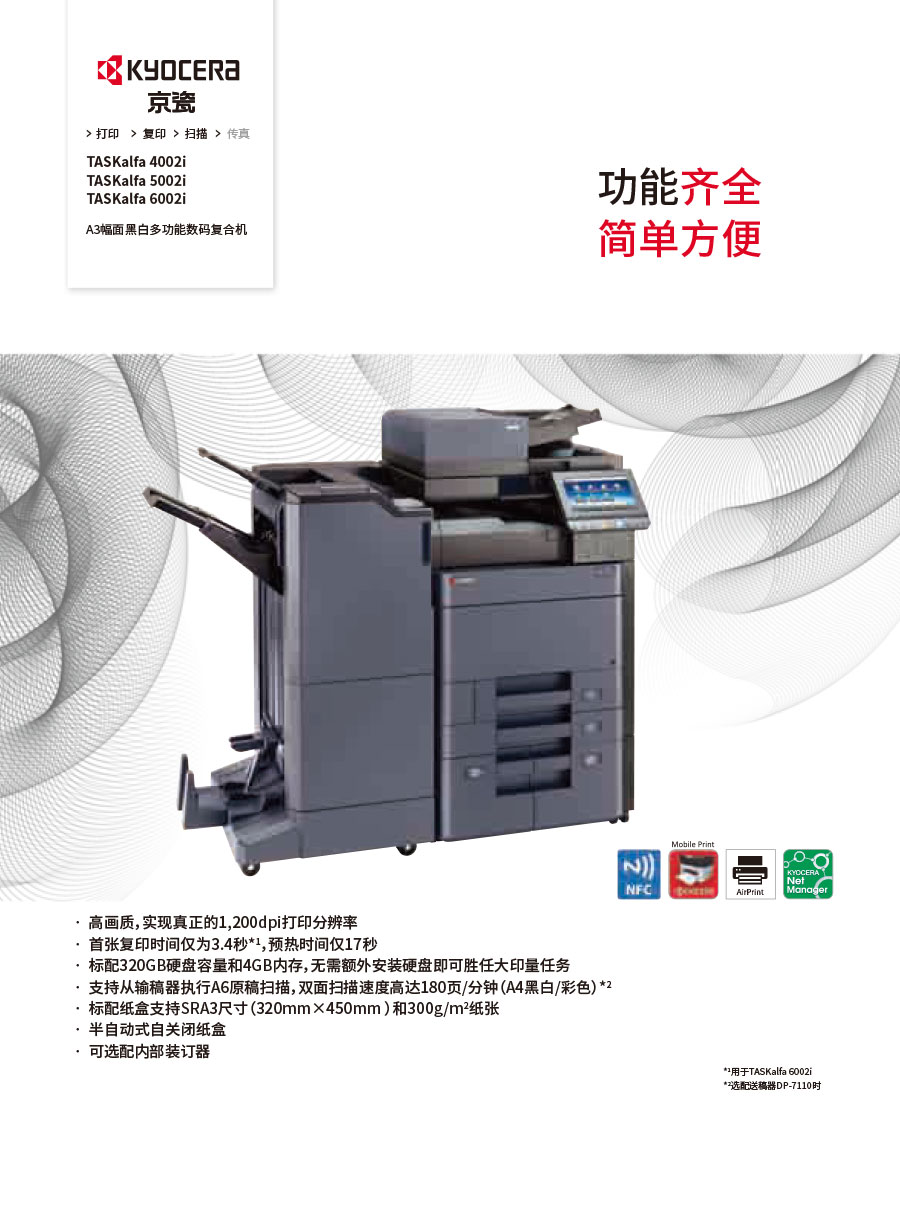 主要產(chǎn)品:KYOCERA京瓷激光打印機(jī),一體機(jī),復(fù)合機(jī),生產(chǎn)型彩色噴墨數(shù)碼印刷系統(tǒng)及辦公信息系統(tǒng)的開發(fā)、設(shè)計(jì)、系統(tǒng)集成