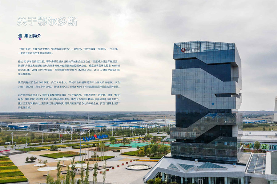 “鄂爾多斯”在蒙古語(yǔ)中意為“宮殿成群的地方”,現(xiàn)如今,它也代表著一座城市、一個(gè)品牌、一家企業(yè)和四萬(wàn)員工共同的理想。經(jīng)過(guò)40 多年的持續(xù)發(fā)展,鄂爾多斯已經(jīng)從當(dāng)初的羊絨制品加工企業(yè),發(fā)展成為涵蓋羊絨服裝、資源礦產(chǎn)開(kāi)發(fā)和能源綜合利用等多元化產(chǎn)業(yè)經(jīng)營(yíng)的大型現(xiàn)代企業(yè)。根據(jù)世界品牌實(shí)驗(yàn)室(WorldBrand Lab)2021年的評(píng)估結(jié)果,鄂爾多斯品牌價(jià)值為1420.68 億元,連續(xù)15 蟬聯(lián)中國(guó)紡織服裝品牌榜首。