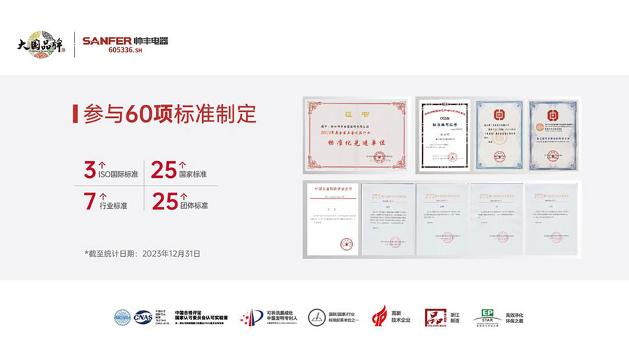 帥豐電器堅持以品質(zhì)為導(dǎo)向,擁有行業(yè)首個“中國合格評定國家認可委員會認可實驗室”,包含燃氣、電氣、噪聲、氣味降低度、油脂分離度、環(huán)境、包裝等多個行業(yè)一流的試驗室,可開展上百項集成灶指標(biāo)檢測,為產(chǎn)品品質(zhì)和新品研發(fā)提供了有力保障。代表行業(yè)參與60個標(biāo)準(zhǔn)制定,包括3個ISO國際標(biāo)準(zhǔn)、25個國家標(biāo)準(zhǔn)、7個行業(yè)標(biāo)準(zhǔn)、25個團體標(biāo)準(zhǔn),為推動行業(yè)發(fā)展做出了重要貢獻。