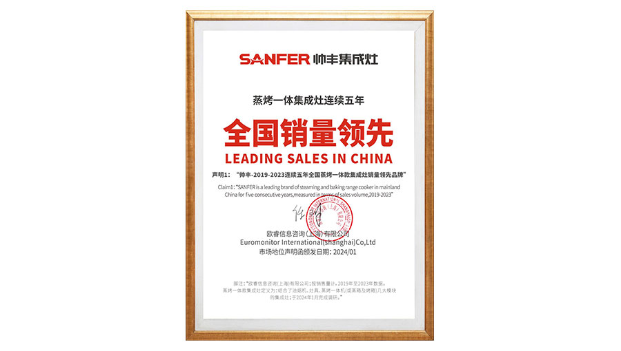 帥豐電器立足用戶需求進行集成灶產(chǎn)品的迭代升級,從消毒柜款、單獨烤箱款、蒸箱款集成灶,到蒸烤一體款,再到蒸烤同步款,不論是在產(chǎn)品功能還是技術(shù)性能上,帥豐電器都處于行業(yè)領(lǐng)先水平,根據(jù)歐睿國際調(diào)研數(shù)據(jù)顯示,帥豐蒸烤一體集成灶2019年-2023年連續(xù)5年全國銷量領(lǐng)先。