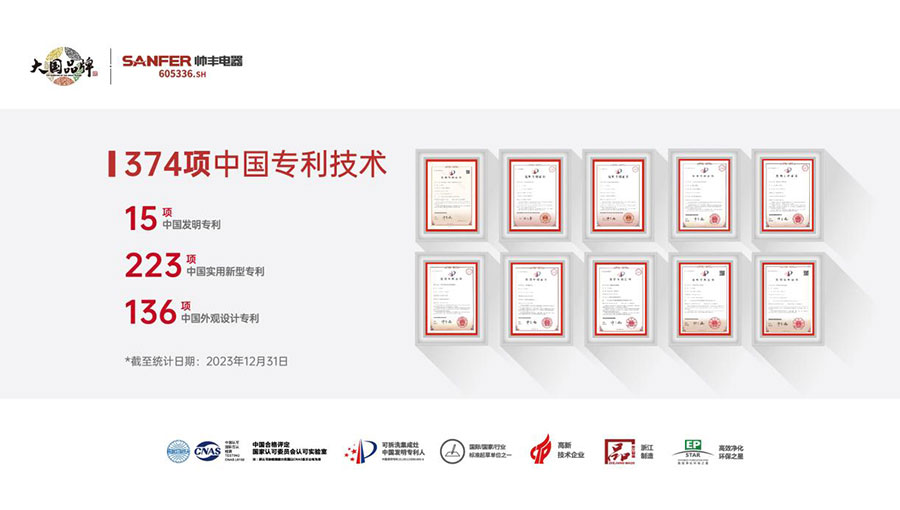 自2005年組建團隊研發(fā)集成灶產(chǎn)品開始,帥豐電器在集成灶領(lǐng)域不斷深耕,截至目前,帥豐電器及其子公司合計擁有專利374項,其中發(fā)明專利15項,實用新型專利223項,外觀設(shè)計專利136項,在集成灶煙機風(fēng)道系統(tǒng)、燃燒器系統(tǒng)、蒸烤箱系統(tǒng)等核心系統(tǒng)的技術(shù)性能上,擁有自主知識產(chǎn)權(quán),且多項系統(tǒng)的性能指標(biāo)領(lǐng)先于行業(yè),直流變頻斑彩螺風(fēng)道系統(tǒng)擁有13項專利認證,增強風(fēng)壓效果,優(yōu)化油煙系統(tǒng),油煙吸凈率99.96%行業(yè)領(lǐng)先;同時,擁有10項改善和降低噪聲的專利認證,消除了置于人體頭部的噪聲源,工作噪聲遠低于國家規(guī)定的上限值且優(yōu)于行業(yè)平均水平;還有帥豐與浙工大聯(lián)合研發(fā)的koms廚房全局監(jiān)控系統(tǒng)——帥豐第十項發(fā)明專利,擁有智慧烹飪、健康提醒、安全防護3大科技功能。