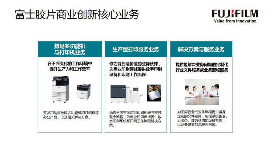 富士膠片商業(yè)創(chuàng)新(中國)有限公司主要向中國市場提供能滿足企業(yè)不同需求的文件管理設(shè)備、解決方案和服務(wù),包括:智能型彩色數(shù)碼多功能機、激光打印機/多功能一體機;能滿足個性化、批量打印等需求的數(shù)字印刷系統(tǒng)和大幅面工程系統(tǒng);以及針對企業(yè)文印和業(yè)務(wù)流程等的外包服務(wù)。富士膠片商業(yè)創(chuàng)新(中國)不斷推出采用云、移動、機器人自動化流程和人工智能等技術(shù)的全行業(yè)數(shù)字化解決方案與服務(wù),為企業(yè)打造數(shù)字化工作空間、數(shù)字化生產(chǎn)力、數(shù)字化工作流程,幫助企業(yè)改善業(yè)務(wù)流程,改變工作方式,加速數(shù)字化轉(zhuǎn)型。該公司在北京、上海、廣州、深圳、沈陽、天津、武漢、成都等城市設(shè)有分支機構(gòu)。