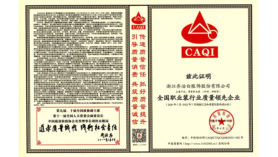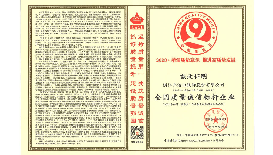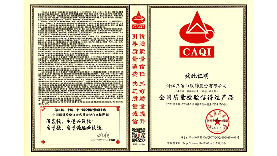 喬治白先后榮獲中國名牌產(chǎn)品、中國職業(yè)裝十大領(lǐng)軍企業(yè)、全國守合同重信用單位、國家級綠色工廠、浙江省智能工廠等榮譽稱號。作為全國標(biāo)準(zhǔn)化工作先進單位,喬治白積極參與標(biāo)準(zhǔn)化工作,先后參與《職業(yè)裝檢驗規(guī)則》、《襯衫》、《女西服、大衣》等9項國家標(biāo)準(zhǔn)的起草與修訂工作,《全毛襯西服》行業(yè)標(biāo)準(zhǔn)起草。