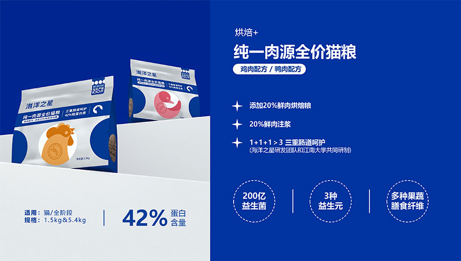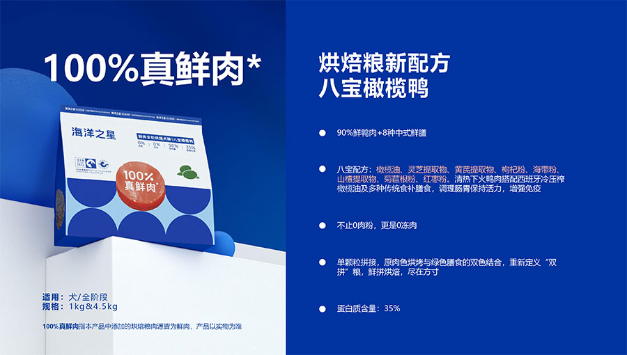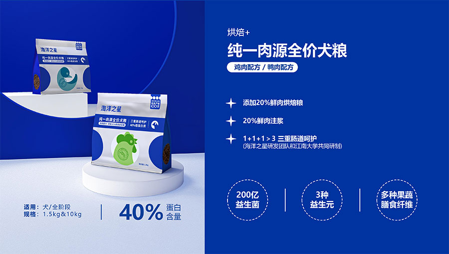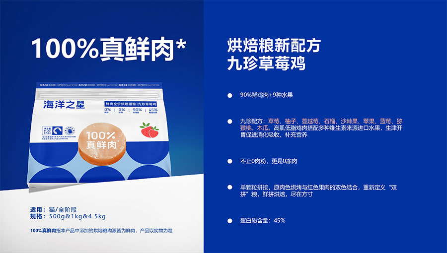 隨著營養(yǎng)消費(fèi)逐步升級(jí),海洋之星品牌產(chǎn)品線延展至多肉源、多品類,并正式布局烘焙糧市場,以“100%真鮮肉*”重新定義高端烘焙糧品類,為寵主和愛寵提供高品質(zhì)的寵物主糧產(chǎn)品。