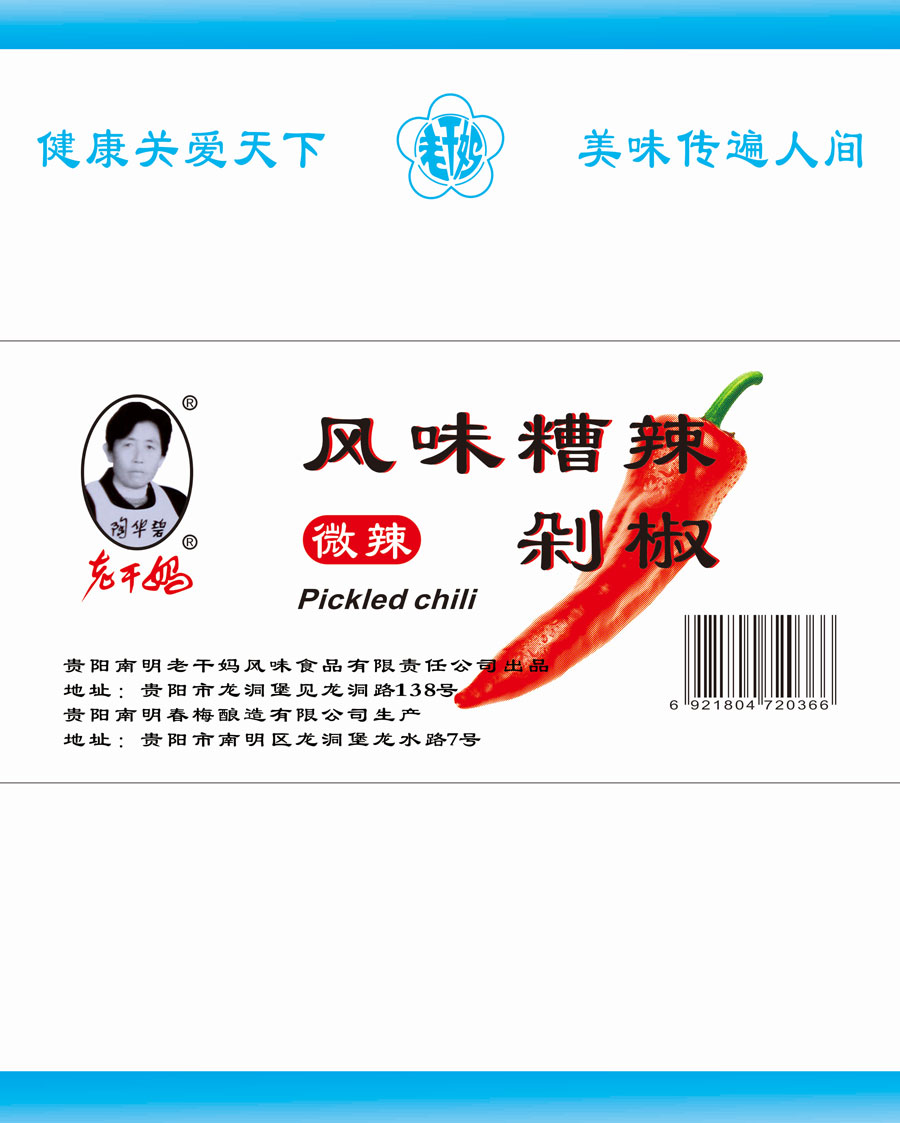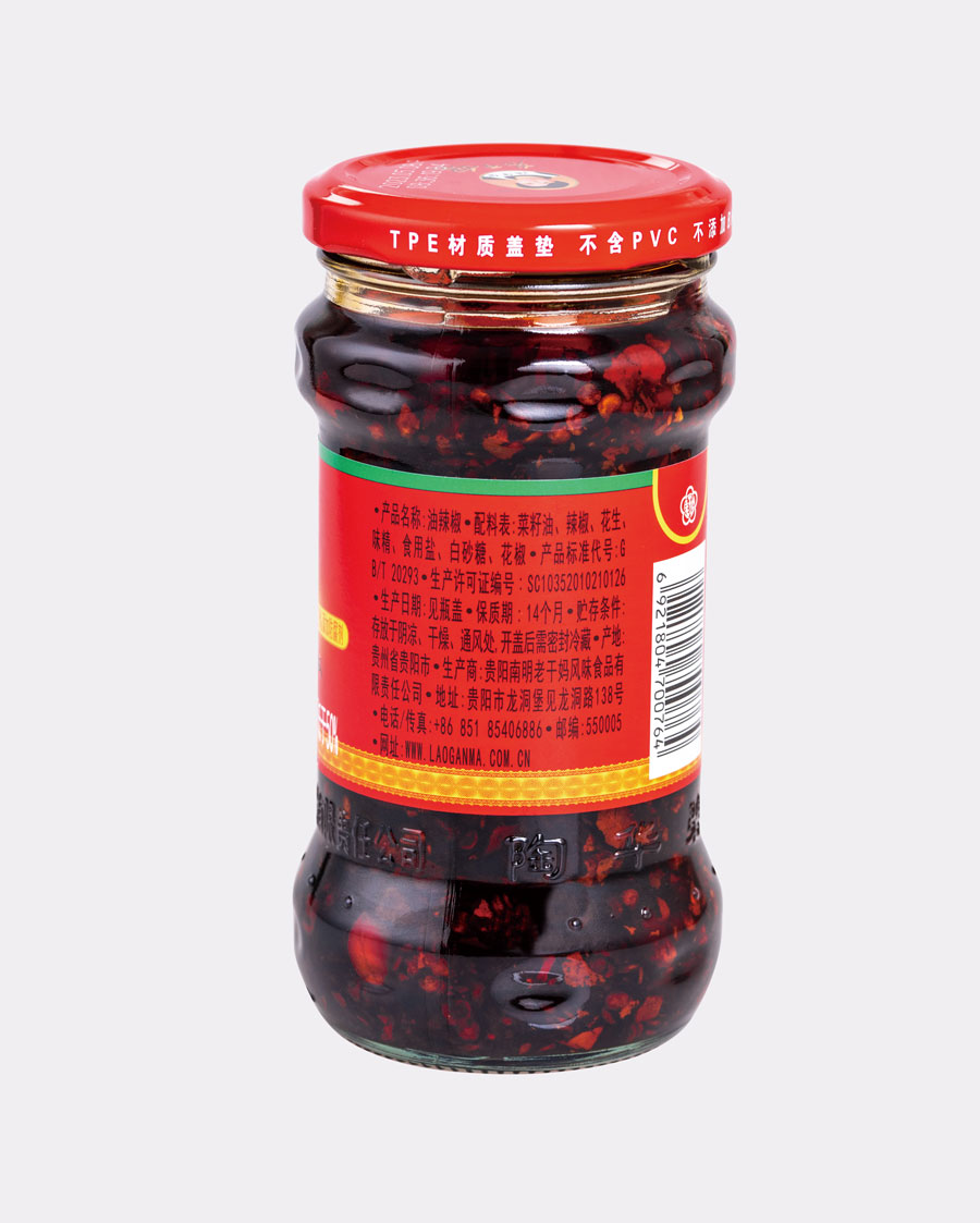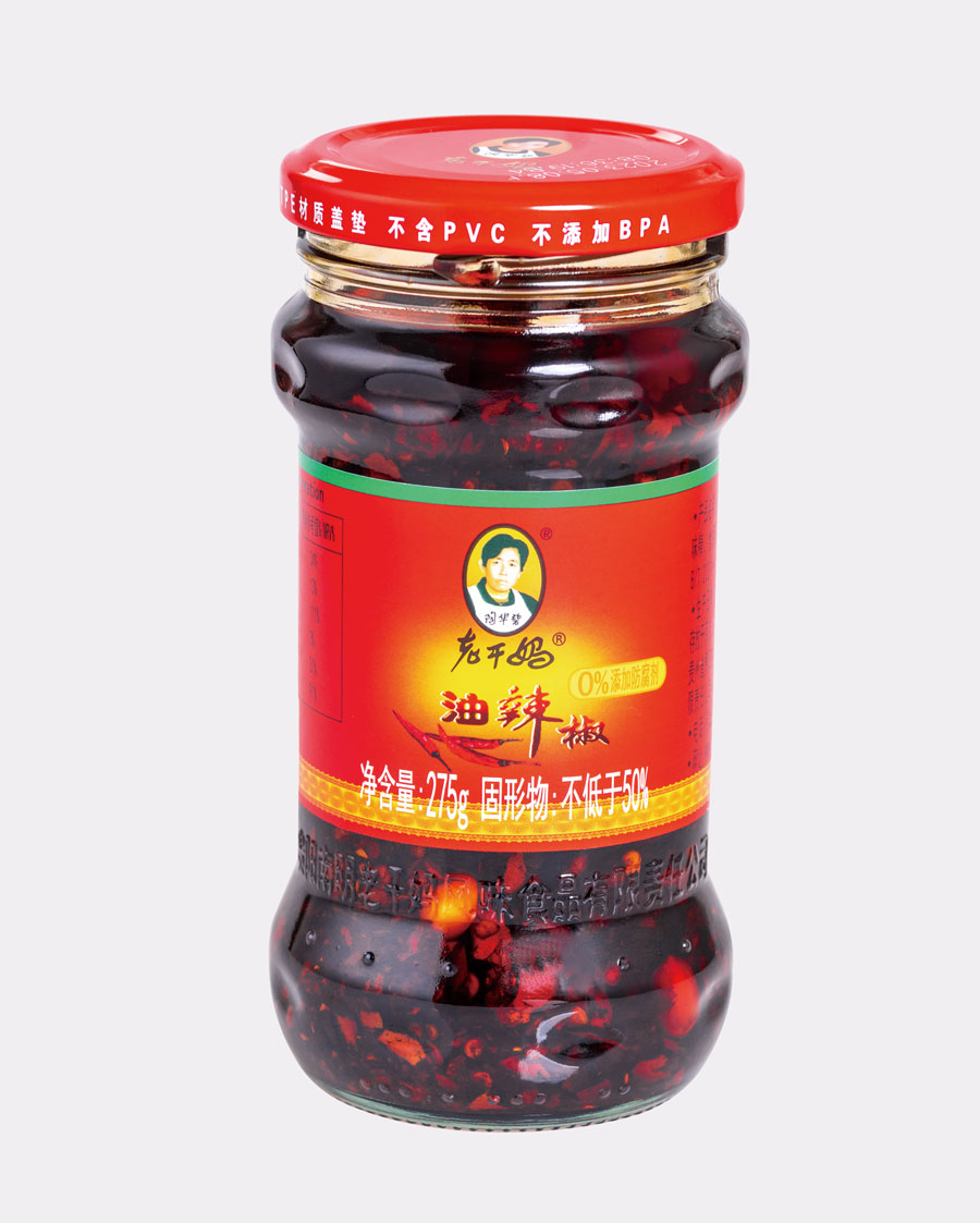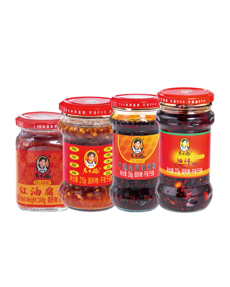 主要產(chǎn)品:老干媽牌油辣椒系列(油辣椒、風(fēng)味豆豉、香菇、精制牛肉末豆豉、辣三丁、香辣脆、干煸肉絲、風(fēng)味雞、肉絲豆豉)、油辣子大塊牛肉醬、火鍋底料(糟辣椒/植物油)、香辣醬、下飯菜、拌飯醬、風(fēng)味水豆豉、紅油腐乳、風(fēng)味腐乳、香辣菜、糟辣剁椒系列(姜蒜/中辣/微辣)、番茄辣醬