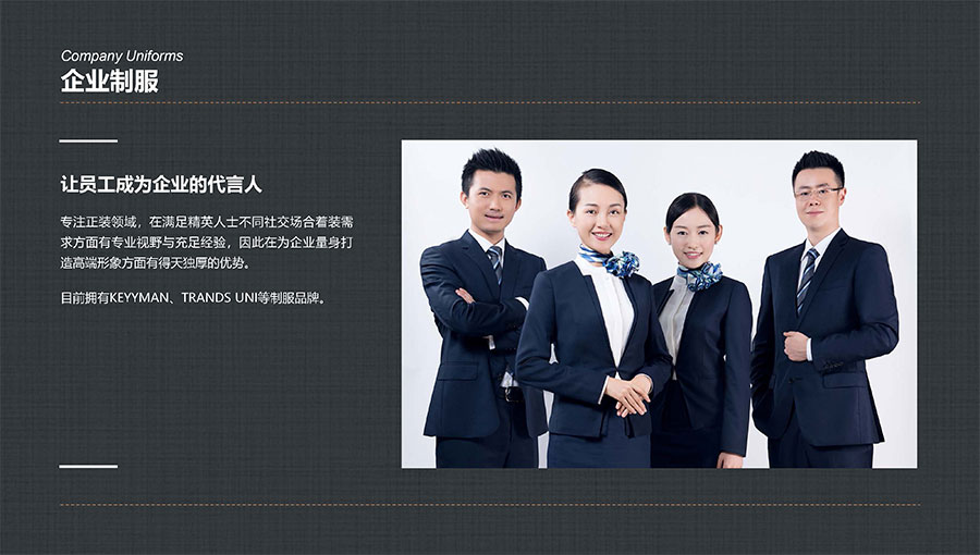 凱門品牌(KEYYMEN):高級職業(yè)裝品牌,企業(yè)形象定制專家。以精湛工藝及最優(yōu)性價(jià)比打造高品質(zhì)、個(gè)性時(shí)尚的企業(yè)形象,專屬于那些為理想、為事業(yè)打拼,并在成功過程中享受生活的職場團(tuán)隊(duì)及精英人士。