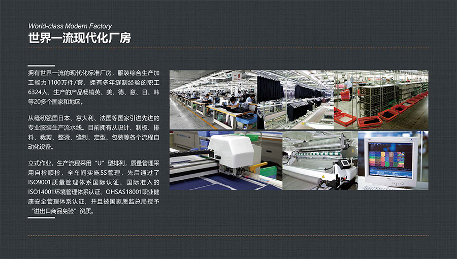 多年來,大楊集團(tuán)深耕主業(yè)、堅(jiān)守實(shí)業(yè),積極開拓國內(nèi)外高端服裝市場,年服裝綜合生產(chǎn)加工能力1100萬件/套,其中年定制服裝生產(chǎn)數(shù)量穩(wěn)居全球第一。年西服出口量600萬件/套,連續(xù)多年排名全國第一。先后被評為世界服裝行業(yè)五百強(qiáng)企業(yè)、全國服裝行業(yè)十強(qiáng)/百強(qiáng)企業(yè)、國家重點(diǎn)扶持的中國名牌出口企業(yè)、國家級重合同守信譽(yù)單位、國家級服務(wù)型制造示范企業(yè)、國家重點(diǎn)培育紡織服裝百家品牌、遼寧省數(shù)字化轉(zhuǎn)型標(biāo)桿企業(yè),榮獲全國五一勞動獎狀、全國文明單位、全國紡織行業(yè)先進(jìn)集體、全國抗擊新冠肺炎疫情先進(jìn)民營企業(yè)、省長質(zhì)量獎等稱號,入選“中國服裝智能制造技術(shù)創(chuàng)新戰(zhàn)略聯(lián)盟”創(chuàng)始會員。同時(shí),大楊集團(tuán)還在同行業(yè)中率先通過“AAA級兩化融合管理體系”評定,以及ISO9001質(zhì)量管理體系國際認(rèn)證、國際準(zhǔn)入的ISO14001環(huán)境管理體系認(rèn)證、ISO45001職業(yè)健康安全管理體系認(rèn)證。