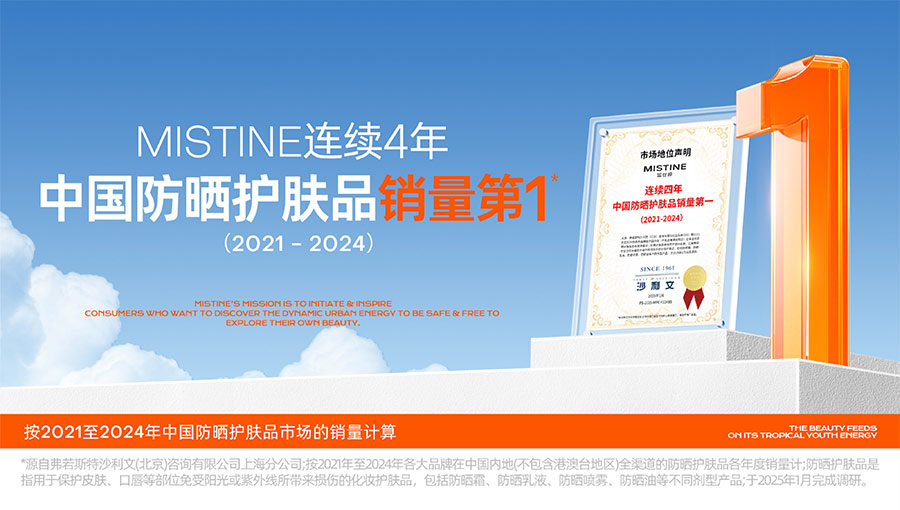 歷經(jīng)37年的科研沉淀,MISTINE蜜絲婷品牌在防曬、護膚、底妝、彩妝多個品類的產(chǎn)品開發(fā)中,堅持圍繞對“光”的研究,在光與防曬護膚、光與色彩妝容的產(chǎn)品應用層面,研究光、理解光、樂享光,持續(xù)不斷地提供產(chǎn)品解決方案,滿足消費者對防曬美白、潮流妝容、護膚健康的需求。防曬系列產(chǎn)品作為MISTINE蜜絲婷的知名品類,以物化生一體的全鏈路防曬技術,憑借高倍防曬、清爽膚感的高功效和高質(zhì)價比勝出,自2021年連續(xù)三年位于中國防曬護膚品銷量領先。