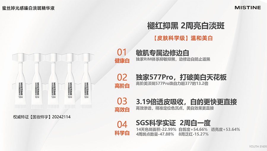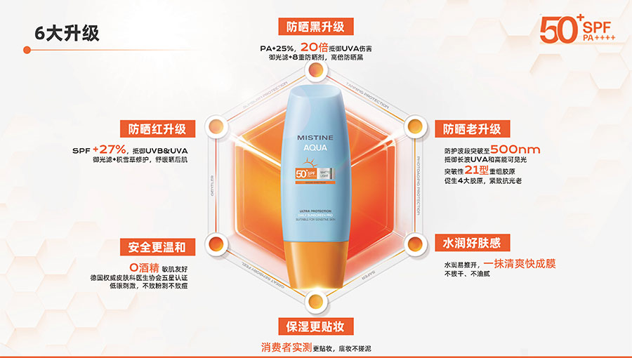 MISTINE蜜絲婷提出皮膚科學、前沿科技、靈魂成分、熱帶美學、卓越功效、保護環(huán)境六大品牌價值,致力于為全球女性提供豐富、安全、高品質(zhì)的美妝產(chǎn)品?;贛ISTINE蜜絲婷品牌首席顧問——全球計算生物學權威之一、諾貝爾化學獎得主Arieh Warshel的研究,MISTINE創(chuàng)新防曬品類推出「光生物學」防曬系統(tǒng),提出“外層防護、中層修護和底層抗損”防曬新理念,引領防曬從“表面防護”進入“深度抗光老”新時代。同時,MISTINE蜜絲婷還持續(xù)深耕專業(yè)彩妝市場,以熱帶美學基因造就產(chǎn)品防水防汗、高倍耐曬、長效持妝的優(yōu)勢,圍繞消費者需求打造多元化的產(chǎn)品矩陣,引領防曬、底妝賽道發(fā)展。