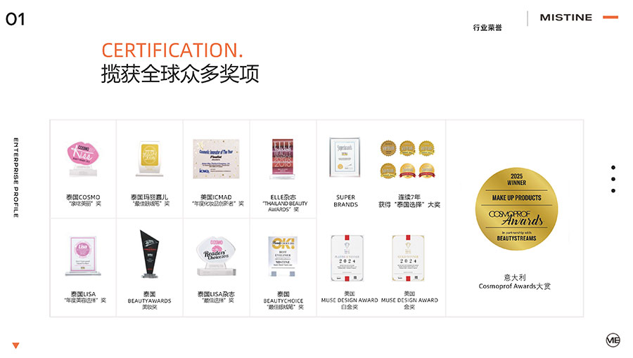 37年來,MISTINE蜜絲婷步履不停,堅持從消費者出發(fā),以優(yōu)質(zhì)專研產(chǎn)品、適時而動的渠道策略和持續(xù)發(fā)力的品牌塑造,贏得眾多消費者的喜愛和行業(yè)內(nèi)外的贊許。迄今,MISTINE蜜絲婷已連續(xù)七年攬獲“泰國選擇”大獎,同時先后榮獲中國化妝品大會藍玫獎「年度競爭力品牌」、IQF國際品質(zhì)節(jié)暨消費領導力峰會「杰出消費影響力品牌」、CAQI中國質(zhì)量網(wǎng)「全國美妝行業(yè)質(zhì)量領先品牌」、天貓金妝獎超級單品「年度防曬獎」、凱度消費者指數(shù)「極具成長力品牌」等榮譽。
