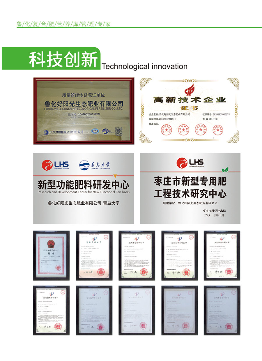 魯化好陽光秉承“營養(yǎng)庫管理專家”的理念,致力于肥料的高效利用,服務(wù)農(nóng)業(yè)生產(chǎn)。魯化好陽光已獲得國家高新技術(shù)企業(yè)認證、ISO9001質(zhì)量體系認證等多項管理資質(zhì)證書。和青島大學、滕州市馬鈴薯品牌培育產(chǎn)業(yè)發(fā)展研究所等多所大學、研究機構(gòu)合作,建立新型肥料研發(fā)中心,取得了豐碩成果。