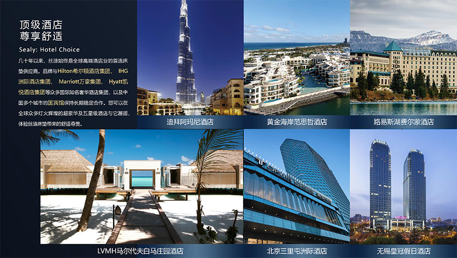 幾十年以來,絲漣始終是全球高端酒店業(yè)的首選床墊供應(yīng)商。品牌與Hilton希爾頓酒店集團(tuán)、IHG洲際酒店集團(tuán)、Marriott萬豪集團(tuán)、Hyatt凱悅酒店集團(tuán)等眾多國際知名奢華酒店集團(tuán),以及中國多個(gè)城市的國賓館保持長期穩(wěn)定合作。您可以在全球眾多燈火輝煌的超豪華及五星級(jí)酒店與它邂逅,體驗(yàn)絲漣床墊帶來的舒適尊貴。