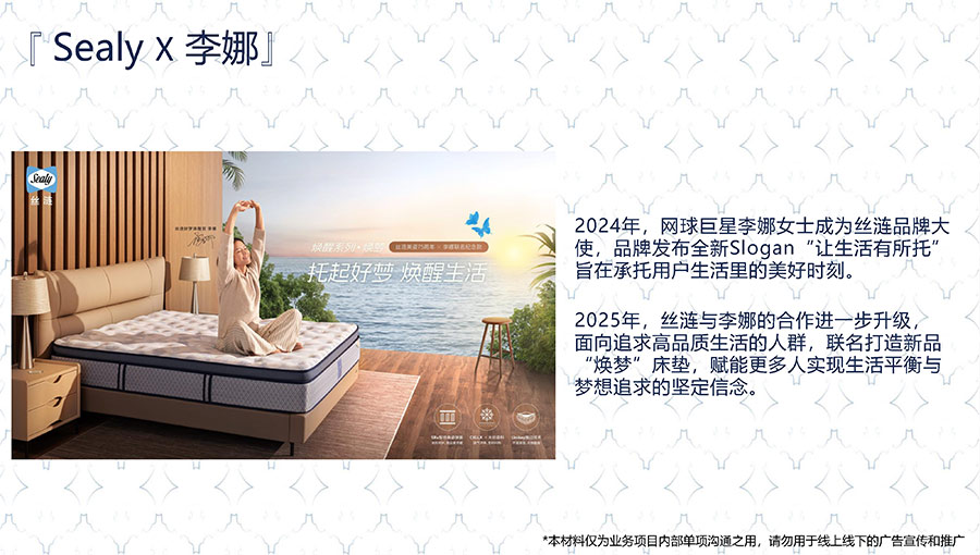 絲漣是上海勞力士大師賽唯一指定床墊及床品品牌,以承托優(yōu)質(zhì)好眠為基礎(chǔ),在熱力揮拍之間盡享優(yōu)雅與時(shí)尚的健康生活方式。