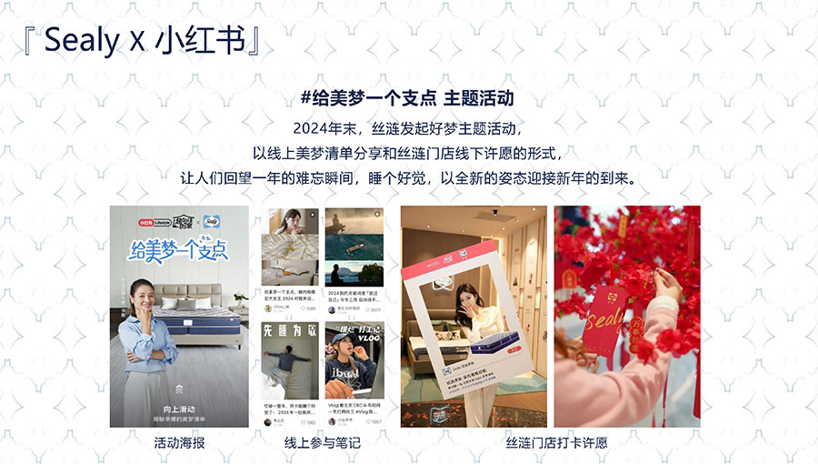 2024年末,絲漣發(fā)起好夢(mèng)主題活動(dòng),以線上美夢(mèng)清單分享和絲漣門店線下許愿的形式,讓人們回望一年的難忘瞬間,睡個(gè)好覺,以全新的姿態(tài)迎接新年的到來。