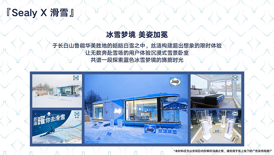 于長白山魯能華美勝地的皚皚白雪之中,絲漣構(gòu)建超出想象的限時(shí)體驗(yàn),讓無數(shù)奔赴雪場(chǎng)的用戶體驗(yàn)沉浸式雪景臥室,共譜一段探索藍(lán)色冰雪夢(mèng)境的旖旎時(shí)光。