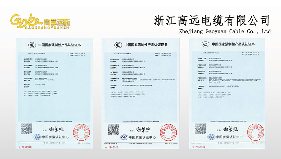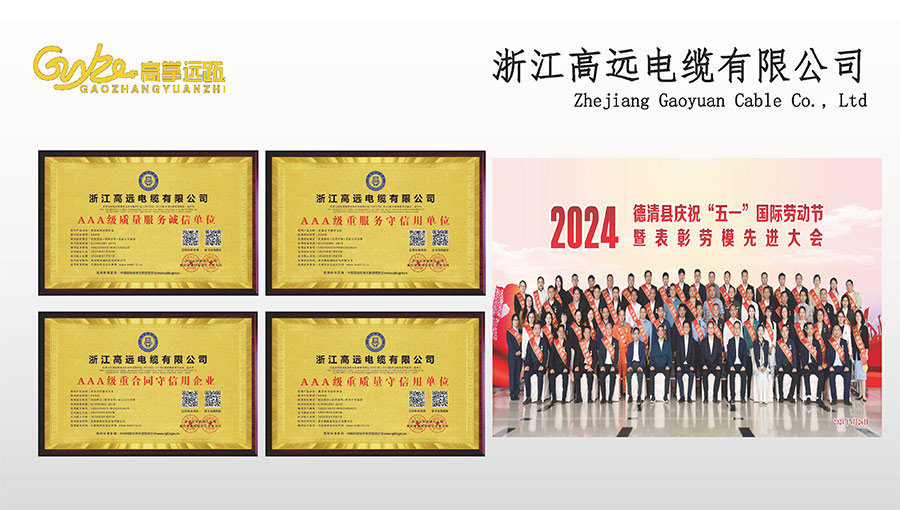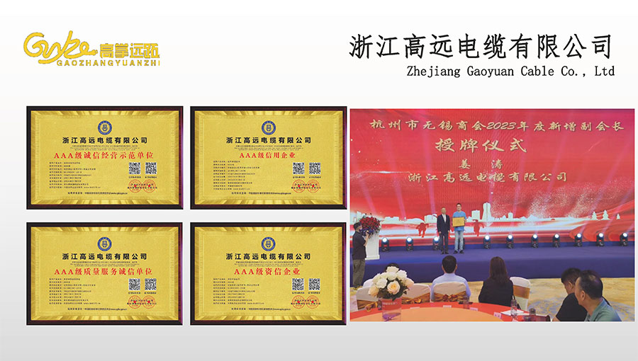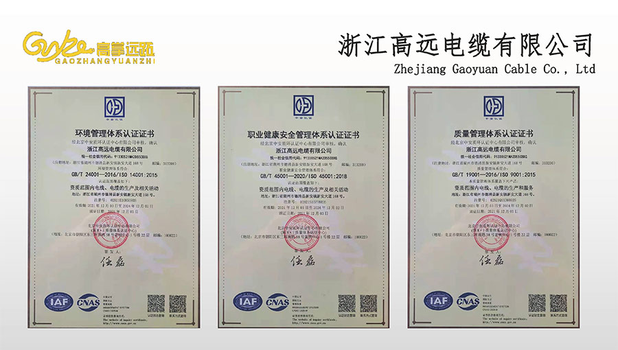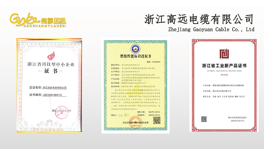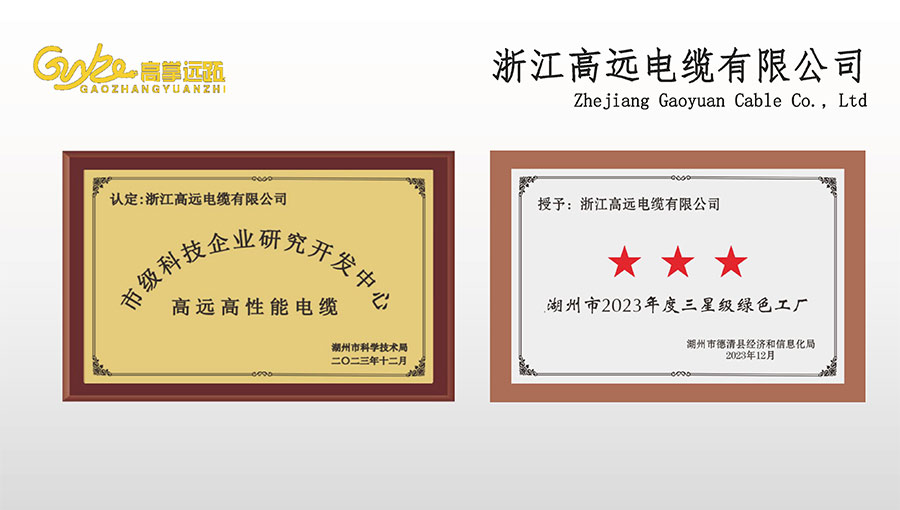 高遠(yuǎn)電纜是浙江省電線電纜重點(diǎn)工業(yè)企業(yè),浙江省專精特新企業(yè)、浙江省科技型企業(yè),浙江省標(biāo)準(zhǔn)化良好行為AAA級(jí)企業(yè);獲得了國家頒發(fā)的生產(chǎn)許可證,通過了CCC國家強(qiáng)制性產(chǎn)品認(rèn)證,ISO9001質(zhì)量體系認(rèn)證,ISO14001環(huán)境體系認(rèn)證,OHSAS18001職業(yè)健康安全管理體系認(rèn)證,PCCC產(chǎn)品認(rèn)證、B1級(jí)燃燒性能授權(quán)書;榮獲浙江省著名商標(biāo),浙江省重合同守信譽(yù)企業(yè),浙江省優(yōu)質(zhì)產(chǎn)品,市級(jí)研究開發(fā)中心,清潔工廠,綠色工廠等國家、省、市授權(quán)的榮譽(yù)稱號(hào),取得了多項(xiàng)發(fā)明專利、實(shí)用型專利。