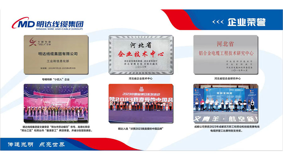 明達(dá)線纜先后被評(píng)為中國(guó)線纜企業(yè)百?gòu)?qiáng)、礦用橡套電纜企業(yè)十強(qiáng)、中國(guó)最具投標(biāo)實(shí)力電線電纜供應(yīng)商百?gòu)?qiáng),國(guó)家高新技術(shù)企業(yè)、國(guó)家級(jí)專精特新小巨人企業(yè)、國(guó)家守合同重信用企業(yè)、全國(guó)質(zhì)量誠(chéng)信示范企業(yè)、點(diǎn)贊2023我喜愛的中國(guó)品牌、全國(guó)用戶滿意星級(jí)產(chǎn)品、河北省民營(yíng)企業(yè)百?gòu)?qiáng)、河北省誠(chéng)信企業(yè)、河北省產(chǎn)業(yè)集群龍頭企業(yè)、河北省企業(yè)技術(shù)中心、河北省制造業(yè)單項(xiàng)冠軍(鋁合金電纜)、河北省企業(yè)標(biāo)準(zhǔn)領(lǐng)跑者、河北省級(jí)標(biāo)準(zhǔn)化良好行為試點(diǎn)企業(yè)、河北省安全生產(chǎn)標(biāo)準(zhǔn)化企業(yè)、邢臺(tái)市政府質(zhì)量獎(jiǎng)、邢臺(tái)市智能電網(wǎng)及輸配電裝備產(chǎn)業(yè)鏈鏈主企業(yè)、邢臺(tái)市電線電纜協(xié)會(huì)會(huì)長(zhǎng)單位等多項(xiàng)資質(zhì)榮譽(yù)。