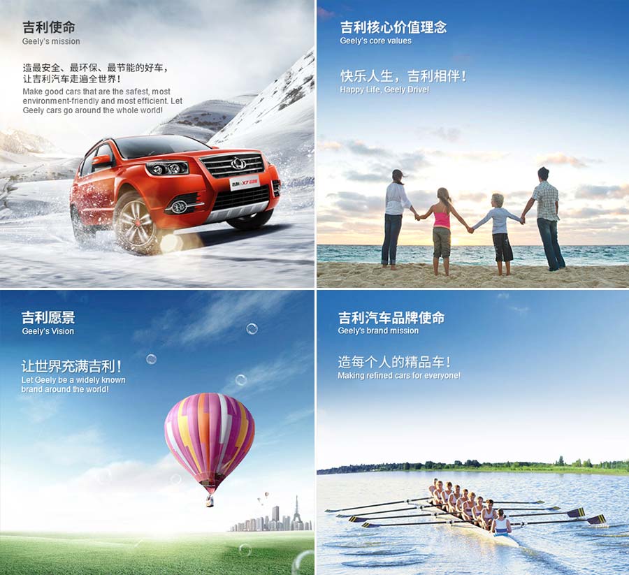 本著“總體跟隨、局部超越、重點突破、招賢納士、合縱連橫、后來居上”的發(fā)展戰(zhàn)略和“快樂人生,吉利相伴”的核心價值理念,浙江吉利控股集團將堅持走科技創(chuàng)新的道路,發(fā)揮團隊智慧,打造具有國際影響力和全球競爭力、受人尊敬的世界500強汽車企業(yè)集團,為中國汽車工業(yè)的崛起,為實現(xiàn)“讓吉利汽車走遍全世界”的美麗追求而奮斗!