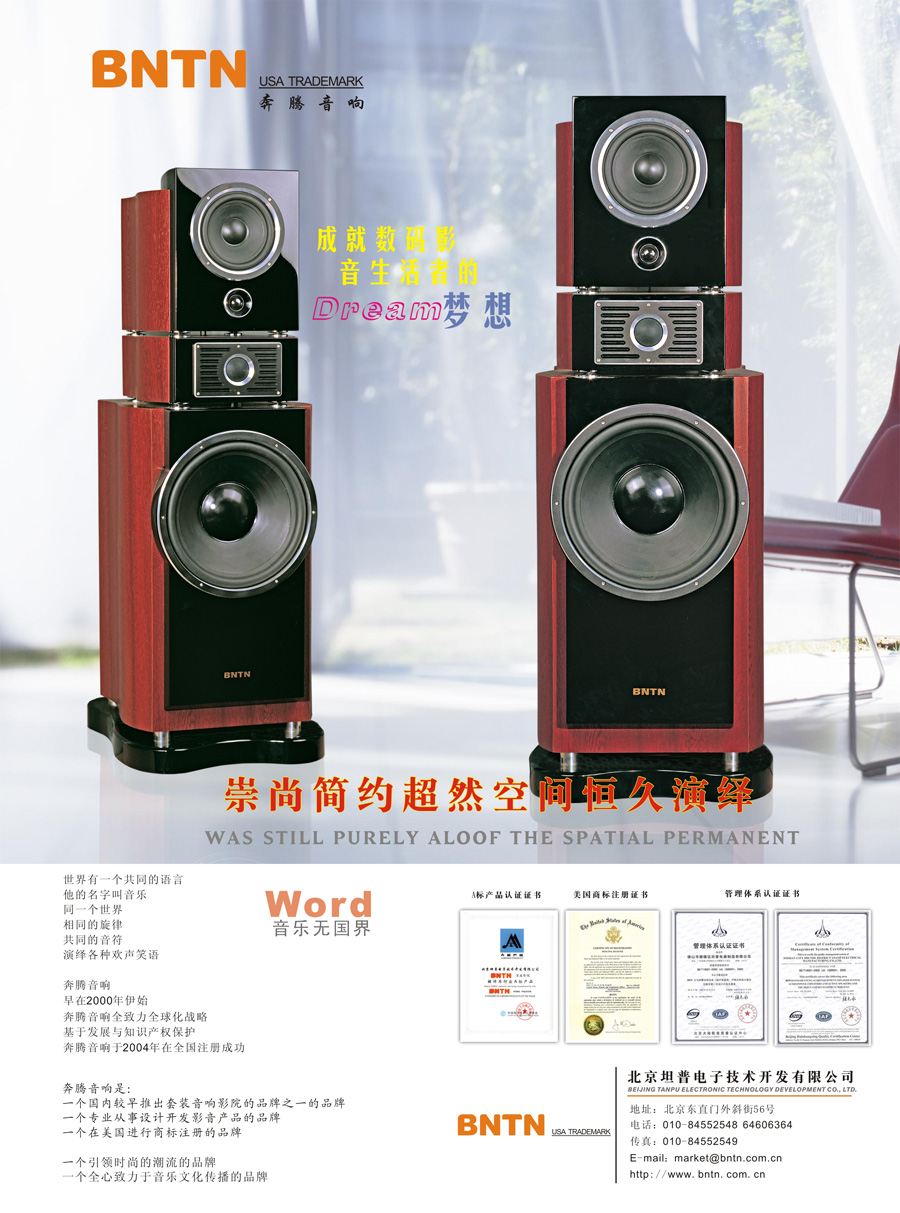 北京坦普電子技術(shù)開(kāi)發(fā)有限公司是一家專業(yè)從事家庭影院設(shè)計(jì)、開(kāi)發(fā)、銷售的公司,其主打品牌BNTN奔騰音響(中國(guó)中文注冊(cè)“萬(wàn)馬奔騰”)是國(guó)內(nèi)較早推出套裝音響影院的品牌之一。