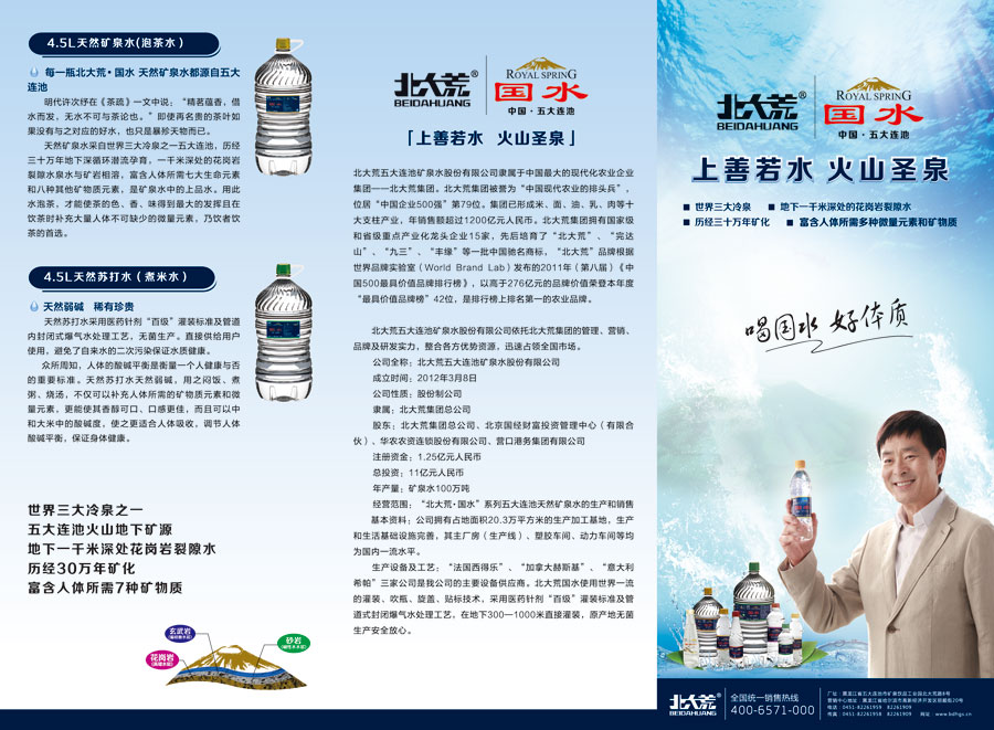 北大荒五大連池礦泉水股份有限公司成立于2012年3月8日,隸屬于北大荒集團總公司,其股東為:北大荒集團總公司、北京國經(jīng)財富投資管理中心(有限合伙)、華農(nóng)農(nóng)資連鎖股份有限公司、營口港務(wù)集團有限公司。其注冊資金1.25億元人民幣,總投資11億元人民幣。北大荒五大連池礦泉水股份有限公司擁有占地面積20.3萬平方米的生產(chǎn)加工基地,生產(chǎn)和生活基礎(chǔ)設(shè)施完善,由主廠房(生產(chǎn)線)、塑膠車間、動力車間、辦公樓、食堂宿舍及相關(guān)附屬設(shè)施組成。其經(jīng)營范圍為“北大荒•國水”系列五大連池天然礦泉水的生產(chǎn)和銷售,礦泉水年產(chǎn)量100萬噸。