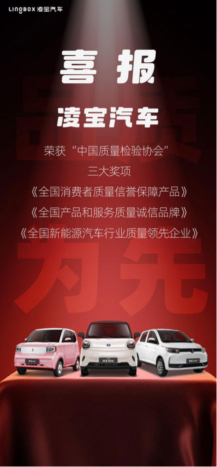 誠信為本,質(zhì)量為先。近日,凌寶汽車摘得中國質(zhì)量檢驗協(xié)會“全國消費者質(zhì)量信譽保障產(chǎn)品”“全國產(chǎn)品和服務(wù)質(zhì)量誠信品牌”“全國新能源汽車行業(yè)質(zhì)量領(lǐng)先企業(yè)”三項大獎,為今年的圓滿收官畫上了濃墨重彩的一筆。