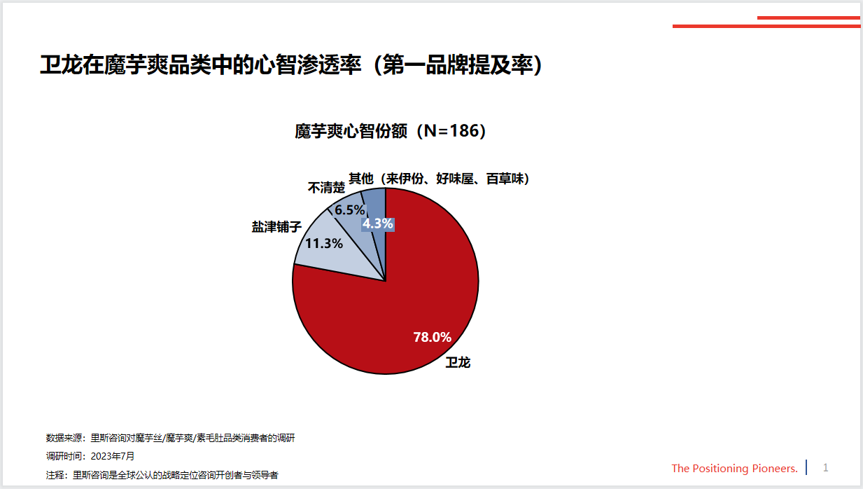 根據(jù)里斯咨詢的調(diào)研顯示,衛(wèi)龍憑借魔芋爽在同品類中的心智滲透率已達(dá)78%,遠(yuǎn)超其他品牌。就在日前,衛(wèi)龍魔芋爽在淘寶平臺(tái)上取得了“淘寶100W+”的銷售成績,拿下淘寶首屆“金桃子獎(jiǎng)”,足以彰顯其在市場(chǎng)上的強(qiáng)大影響力。