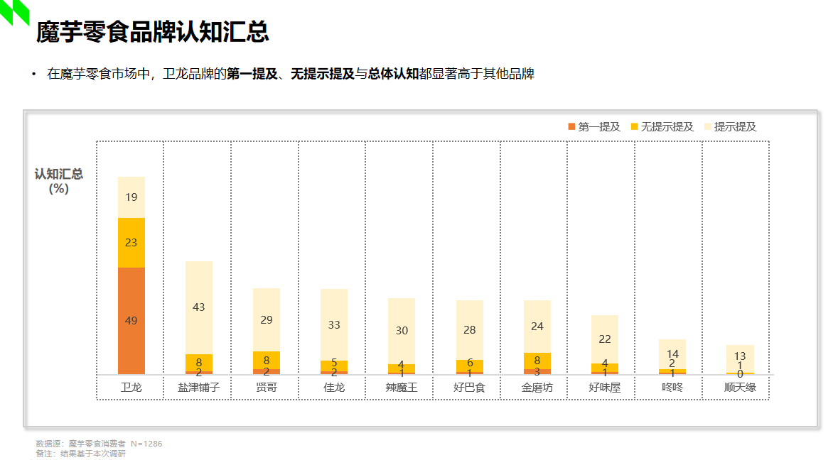 據(jù)2022年尼爾森調(diào)研顯示,在魔芋市場(chǎng)中,衛(wèi)龍品牌的第一提及、無提示提及與總體認(rèn)知都顯著高于其他品牌。顯然,衛(wèi)龍發(fā)明的魔芋爽在市場(chǎng)中已然奠定了良好且堅(jiān)固的受眾認(rèn)知基礎(chǔ),那么“小魔女”的加入,不僅進(jìn)一步充實(shí)了衛(wèi)龍自身的產(chǎn)品矩陣,占位了“魔芋素毛肚”的產(chǎn)品類目,也將引領(lǐng)魔芋休閑食品賽道邁向更高品質(zhì)的發(fā)展方向,為市場(chǎng)打開全新的增量機(jī)遇。