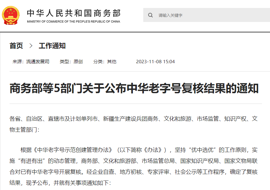 關于公布中華老字號復核結果的通知