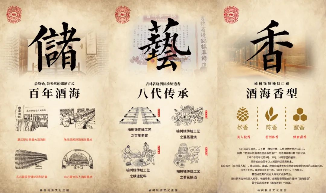 好的品牌需要好的品質作為支撐。長白山源頭好水,天下第一糧倉好糧,歷經(jīng)八代傳承古法匠藝,234個不同年代的酒海,采用長白山百年以上樹齡的優(yōu)質黃松木,長白松木(又稱美人松),輔以麻紙、蜂蠟、鹿血和蛋清等有機物質調和糊制而成的168層內膽,純手工制作,需要100多道工序,300多個時日,工序繁雜,基酒經(jīng)酒海貯藏再入陶壇貯藏多年后,酒體則具有獨特的美人松香、老酒陳香、蜂蜜甜香,是榆樹錢酒業(yè)獨特的“酒海香型”。