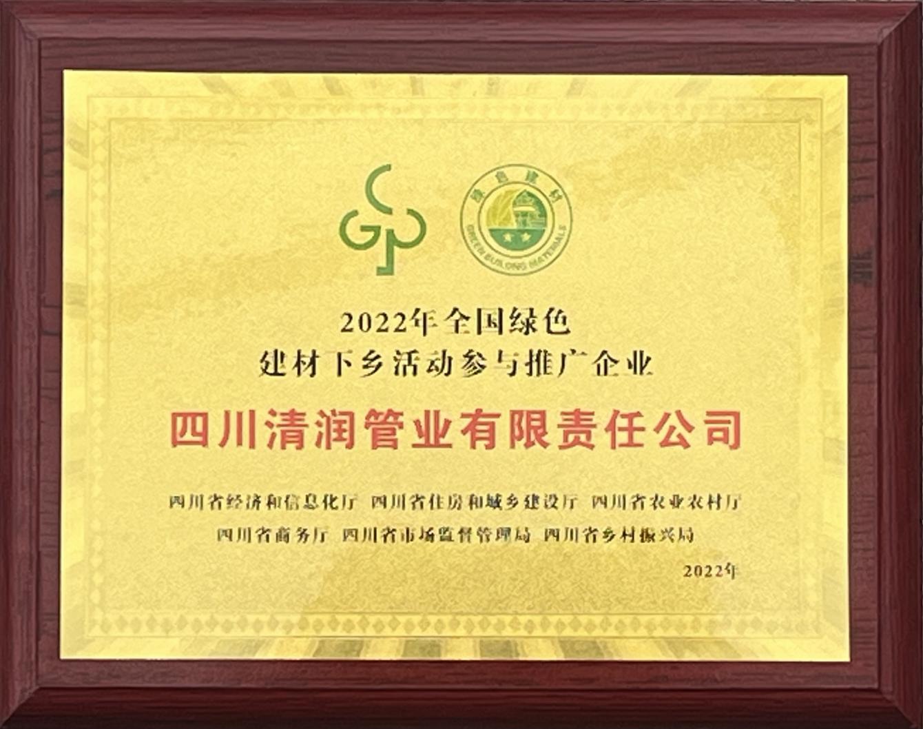“清潤”自成立以來,便以“打造安全的城市地下生命線”為己任,先后為農飲工程、四川大學、西南民族大學、第31屆世界大學生夏季運動會場館等項目供應了一系列的優(yōu)質給水管材管件產品,得到了市場廣大客戶和社會各界的一致肯定。公司先后獲得了“四川名牌”、成都市市級守合同重信用企業(yè)稱號,入選《全國農村飲水安全工程材料設備產品信息年報》、《成都市地方產品配套目錄》,信用等級AA級,成為中國塑料加工工業(yè)協(xié)會塑料管道專業(yè)委員會理事單位、中國工業(yè)防腐蝕技術協(xié)會、四川燃氣協(xié)會等協(xié)會會員單位。2022年,在全國綠色建材產品四川站啟動會上,四川清潤管業(yè)還作為優(yōu)秀代表企業(yè)獲得授牌。