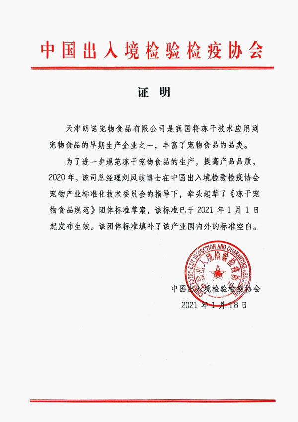 朗諾作為國內(nèi)率先將國際前沿凍干技術(shù)應(yīng)用于寵物食品研發(fā)及生產(chǎn)的企業(yè),始終以推動凍干寵物食品行業(yè)規(guī)范、引領(lǐng)產(chǎn)業(yè)升級為己任。早在2021年1月在寵工委的指導(dǎo)下,由朗諾領(lǐng)銜起草制定《凍干寵物食品規(guī)范》正式頒布實施,為中國凍干寵物食品樹立細(xì)分行業(yè)標(biāo)準(zhǔn)。