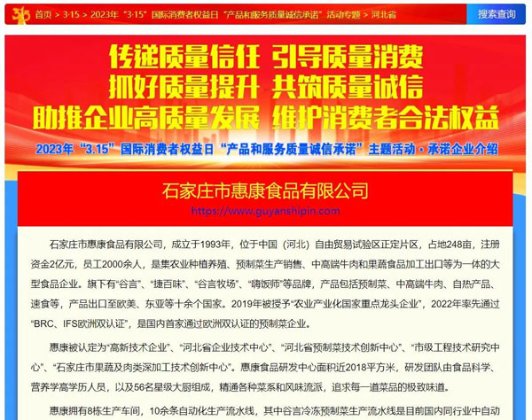 傳遞質(zhì)量信任,引導(dǎo)質(zhì)量消費(fèi),近日,由中國質(zhì)量檢驗協(xié)會主辦的2023年3·15國際消費(fèi)者權(quán)益日“產(chǎn)品和服務(wù)質(zhì)量誠信承諾”主題活動順利召開。在本次活動中,石家莊市惠康食品有限公司憑借優(yōu)質(zhì)的產(chǎn)品質(zhì)量及誠信經(jīng)營榮膺“全國產(chǎn)品和服務(wù)質(zhì)量誠信示范企業(yè)”,““全國預(yù)制菜行業(yè)質(zhì)量領(lǐng)先企業(yè) ”,公司旗下谷言預(yù)制菜系列產(chǎn)品榮獲“全國消費(fèi)者質(zhì)量信譽(yù)保障產(chǎn)品”榮譽(yù)。為營造公平、公正、誠信經(jīng)營的市場環(huán)境,樹立質(zhì)量標(biāo)桿、弘揚(yáng)質(zhì)量先進(jìn)做出了表率作用。