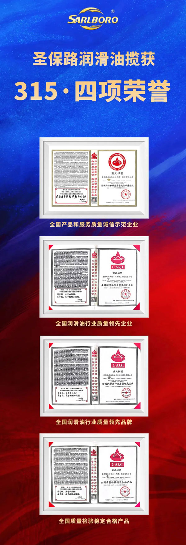 在“3·15”國際消費者權(quán)益日到來之際,圣保路再度榮獲中國質(zhì)量檢驗協(xié)會頒發(fā)的2023年“全國產(chǎn)品和服務(wù)質(zhì)量誠信示范企業(yè)”、“全國潤滑油行業(yè)質(zhì)量領(lǐng)先企業(yè)”、“全國潤滑油行業(yè)質(zhì)量領(lǐng)先品牌”、“全國質(zhì)量檢驗穩(wěn)定合格產(chǎn)品”四項榮譽(yù)稱號。