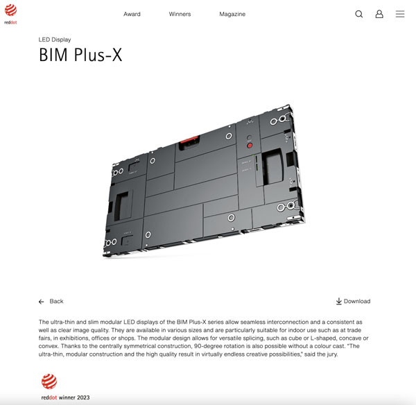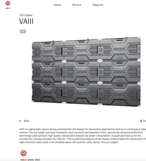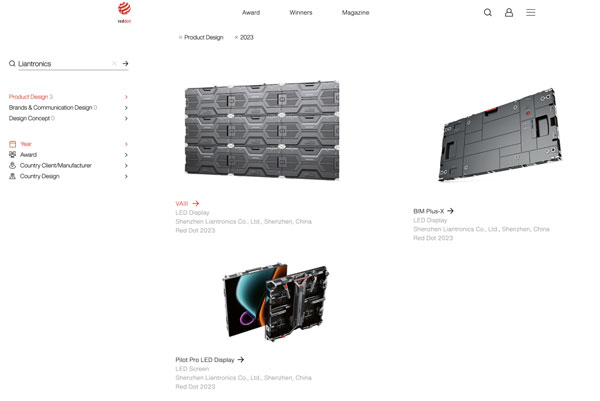 近日,2023年德國紅點(diǎn)設(shè)計(jì)大獎(jiǎng)名單公布。聯(lián)建光電VAIII系列微間距顯示屏、Pilot Pro系列租賃顯示屏、BIM Plus-X系列室內(nèi)商業(yè)顯示屏三款產(chǎn)品同時(shí)斬獲素有設(shè)計(jì)界“奧斯卡”之稱的紅點(diǎn)設(shè)計(jì)獎(jiǎng),這三款產(chǎn)品凝聚著全球前沿技術(shù)和創(chuàng)新設(shè)計(jì),實(shí)至名歸。據(jù)統(tǒng)計(jì),聯(lián)建光電是2023紅點(diǎn)獎(jiǎng)中獲獎(jiǎng)最多的LED顯示品牌。