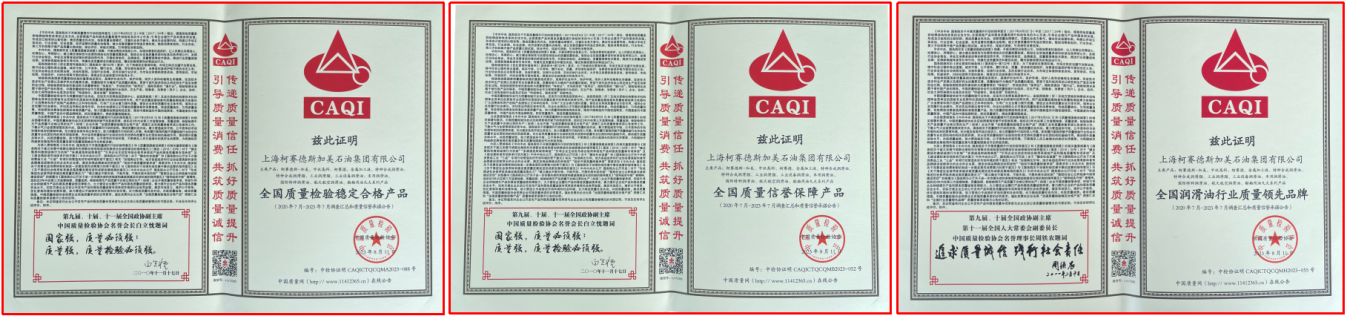 迎接即將到來的又一個全國質量月——9月之際,8月11日,中國質量協(xié)會向上??沦惖滤辜用朗图瘓F有限公司頒發(fā)三大榮譽,即全國質量檢驗穩(wěn)定合格產(chǎn)品、全國質量信譽保障產(chǎn)品、全國潤滑油行業(yè)質量領先品牌。這是在新的市場形勢下,柯賽德斯加美石油集團深耕能源,堅持質量振興企業(yè)、科技助推發(fā)展、誠信塑造品牌戰(zhàn)略的長期努力結出的碩果。