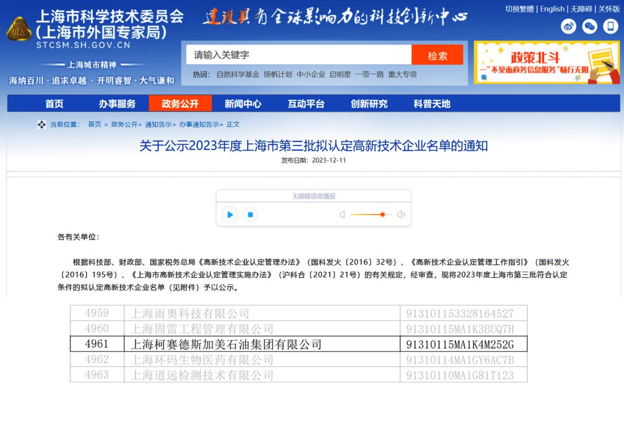 柯賽德斯加美石油集團被認定為“高新技術(shù)”企業(yè)