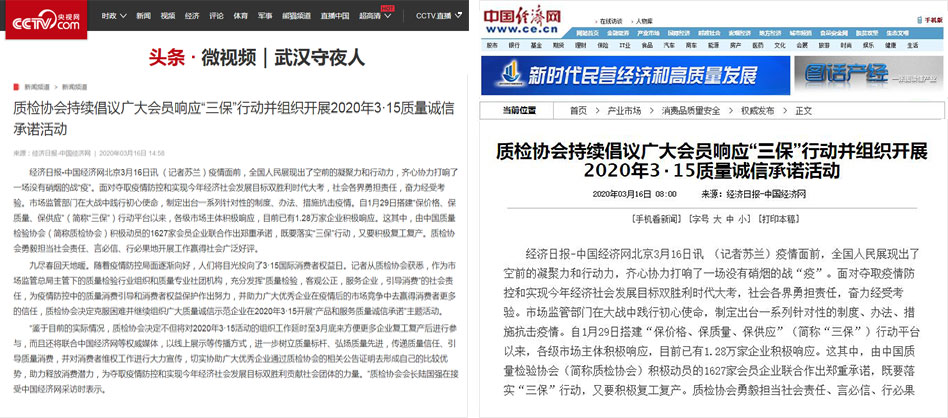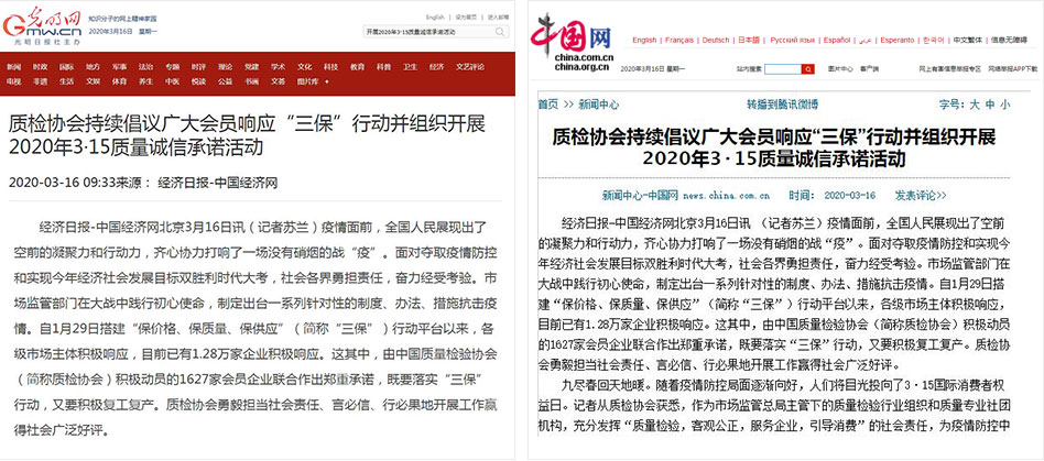 新浪網(wǎng)《質(zhì)檢協(xié)會持續(xù)倡議廣大會員響應(yīng)“三保”行動并組織開展2020年3·15質(zhì)量誠信承諾活動》