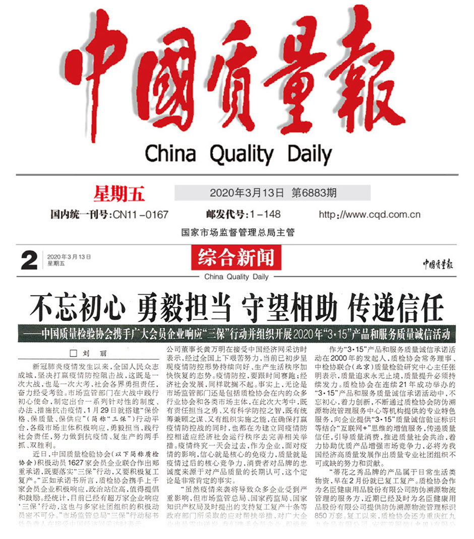 中國質(zhì)量報《不忘初心 勇毅擔(dān)當(dāng) 守望相助 傳遞信任——中國質(zhì)量檢驗協(xié)會攜手廣大會員企業(yè)響應(yīng)“三?!毙袆硬⒔M織開展2020年“3·15”產(chǎn)品和服務(wù)質(zhì)量誠信活動》