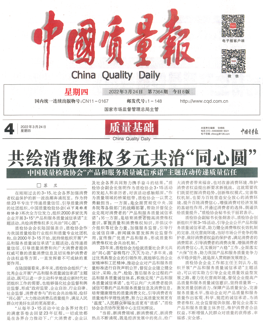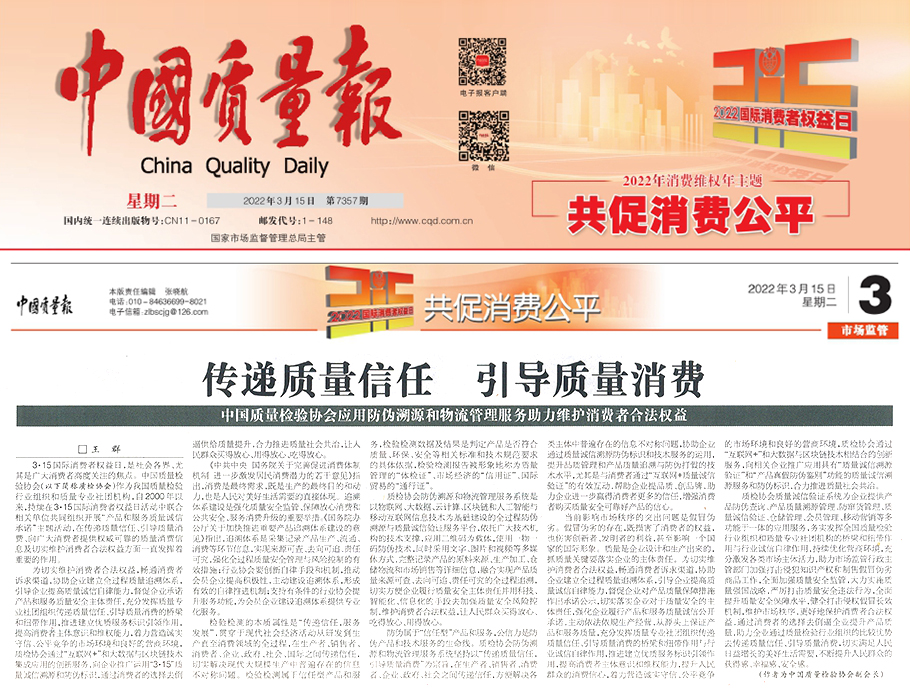 中國(guó)質(zhì)量報(bào)(3月15日刊第2版):推動(dòng)質(zhì)量共治 優(yōu)化營(yíng)商環(huán)境 共筑質(zhì)量誠(chéng)信——中國(guó)質(zhì)量檢驗(yàn)協(xié)會(huì)攜手2000余家企業(yè)組織開(kāi)展“3 ·15”產(chǎn)品和服務(wù)質(zhì)量誠(chéng)信承諾主題活動(dòng)