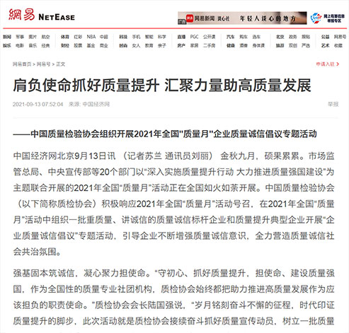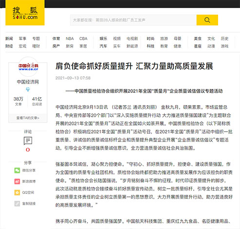 搜狐網(wǎng):肩負(fù)使命抓好質(zhì)量提升 匯聚力量助高質(zhì)量發(fā)展——中國質(zhì)量檢驗協(xié)會組織開展2021年全國“質(zhì)量月”企業(yè)質(zhì)量誠信倡議專題活動