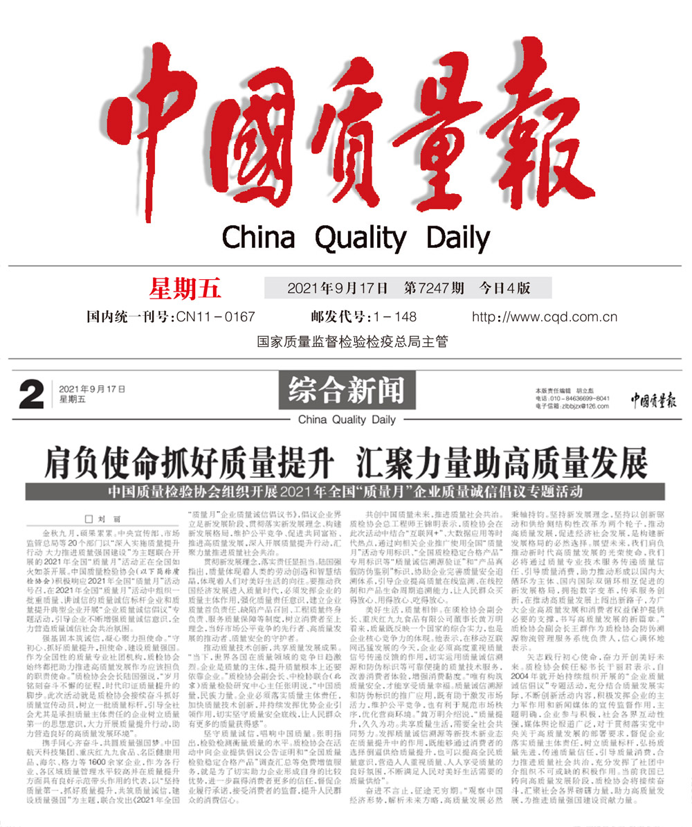 新浪網(wǎng):肩負(fù)使命抓好質(zhì)量提升 匯聚力量助高質(zhì)量發(fā)展——中國質(zhì)量檢驗協(xié)會組織開展2021年全國“質(zhì)量月”企業(yè)質(zhì)量誠信倡議專題活動